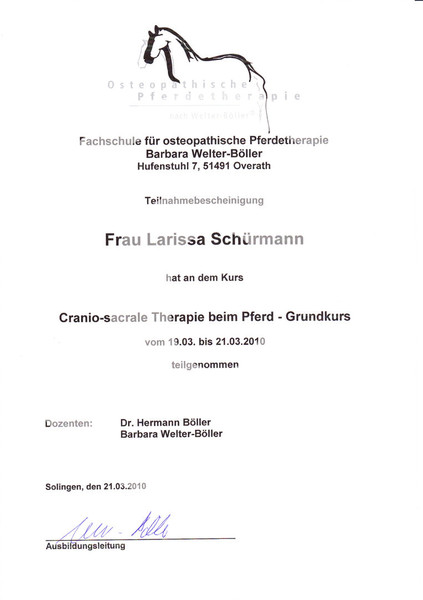 - 2010 Cranio- Sacrale Therapie am Pferd (bei Barbara Welter- Böller)